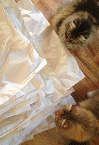 Here, Tricksey and Pepper have discovered a huge daddy-long-legs crawling around on a pile of packing paper. They're both afraid to step on the paper, so the critter is safe as long as he stays there. But the cats aren't afraid to nervously swat at him, and so he runs from edge to edge to avoid their paws; and the cats follow him. I left before I saw how that game ended.