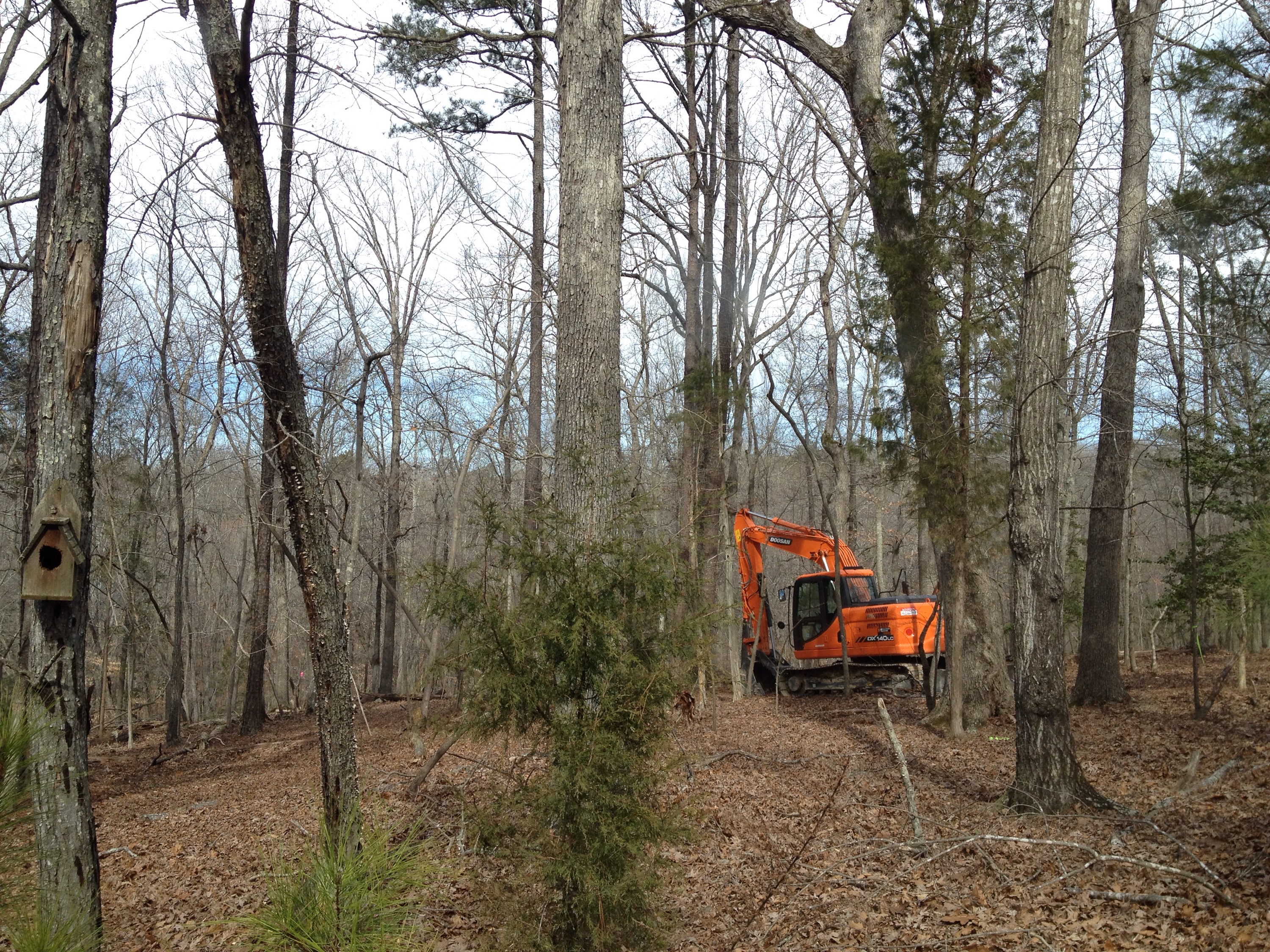 Here we see a solitary male excavator resting in the forest. Soon, if weather allows, he'll begin his harvest of the surrounding trees and boulders. If the birds who live in that house on the left are lucky, he will spare their tree.
